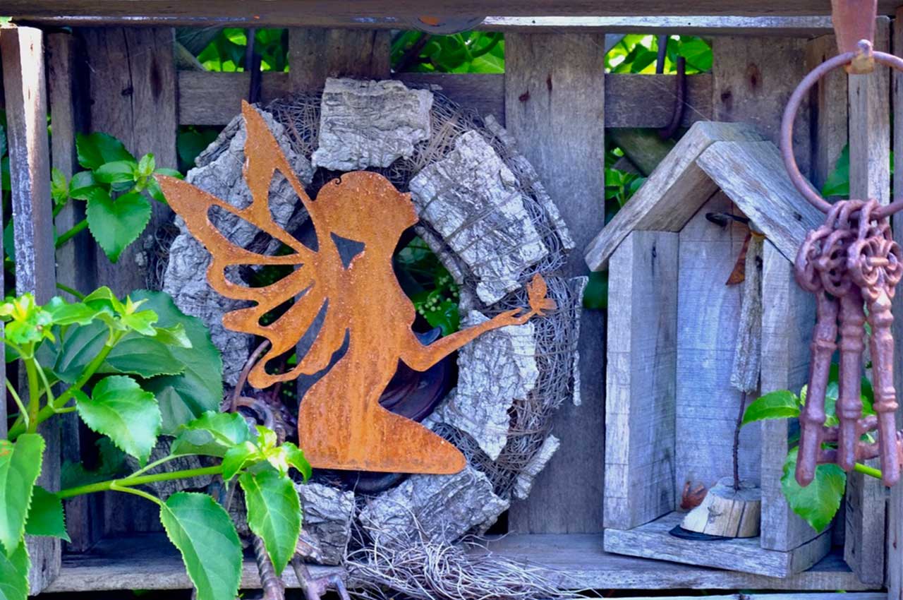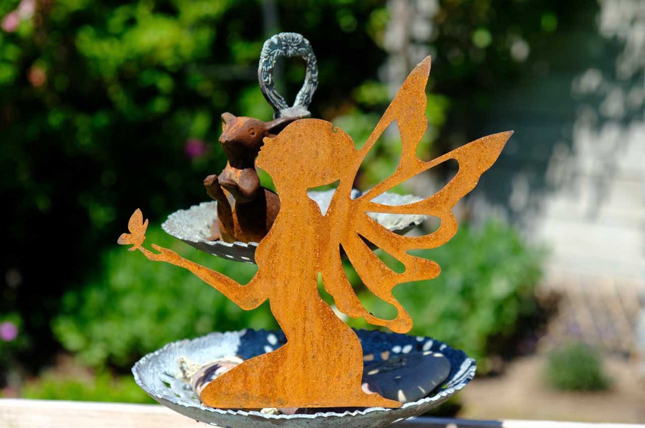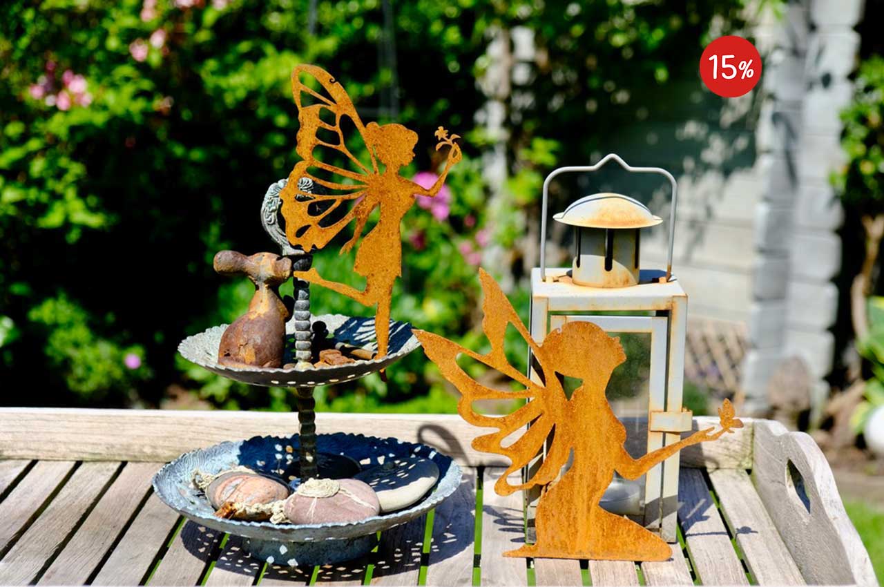 Unsere Feen sind aus 1,5 mm starkem Spezialstahl gelasert und bekommt nach einer Weile eine schöne, witterungsbedingte Rostschicht.