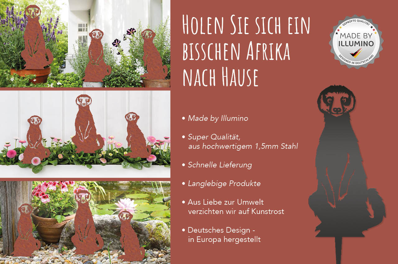 Nach einer Weile bekommt der Beetstecker eine Rostschicht. (Aus Umweltschutzgründen verzichten wir bewusst auf Kunstrost.) Durch diese Farbe bekommen die Erdmännchen einen noch natürlicheren, mediterranen Touch. Bitte beachten Sie daher, dass es Farbabweichungen geben kann!