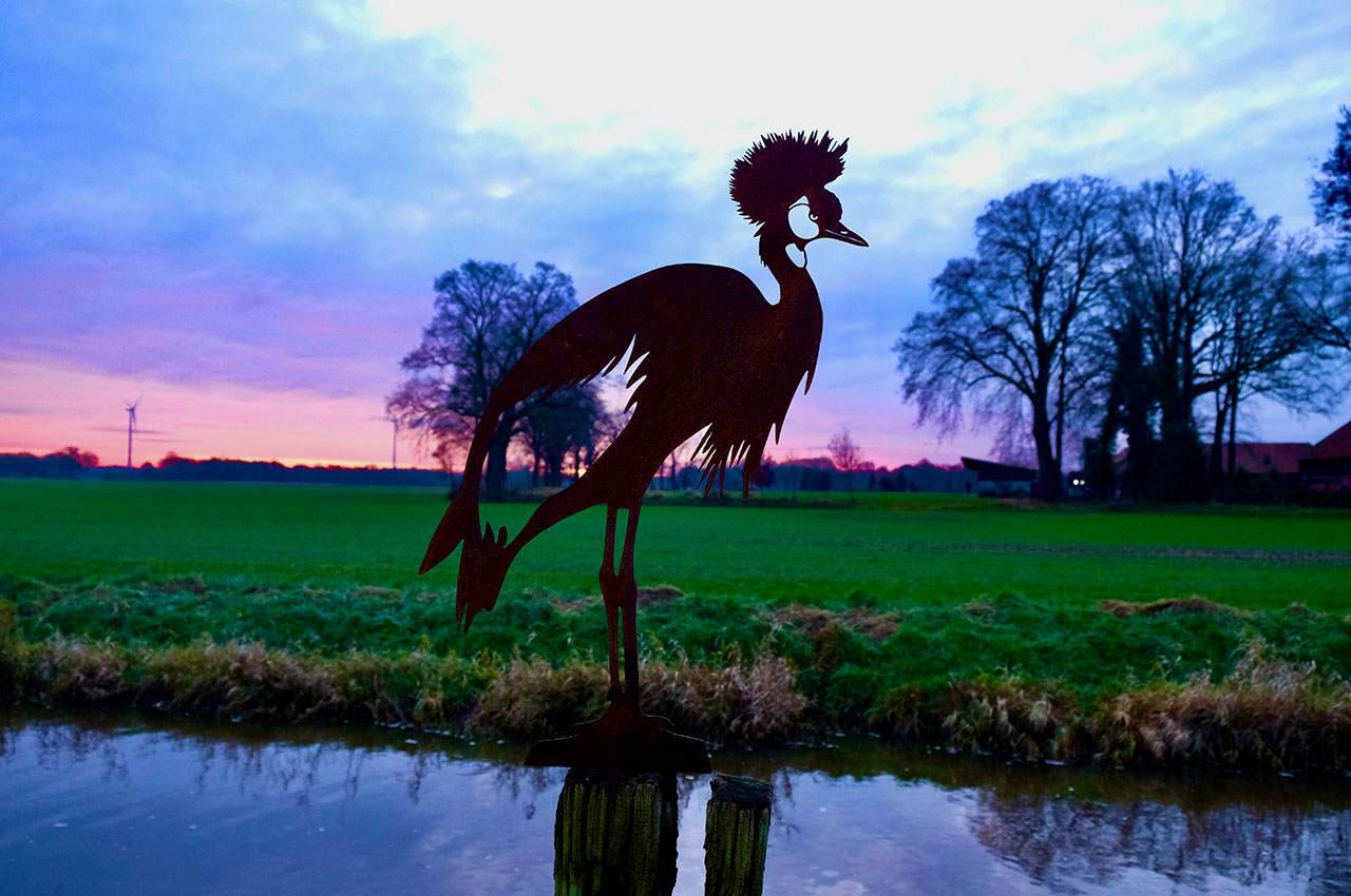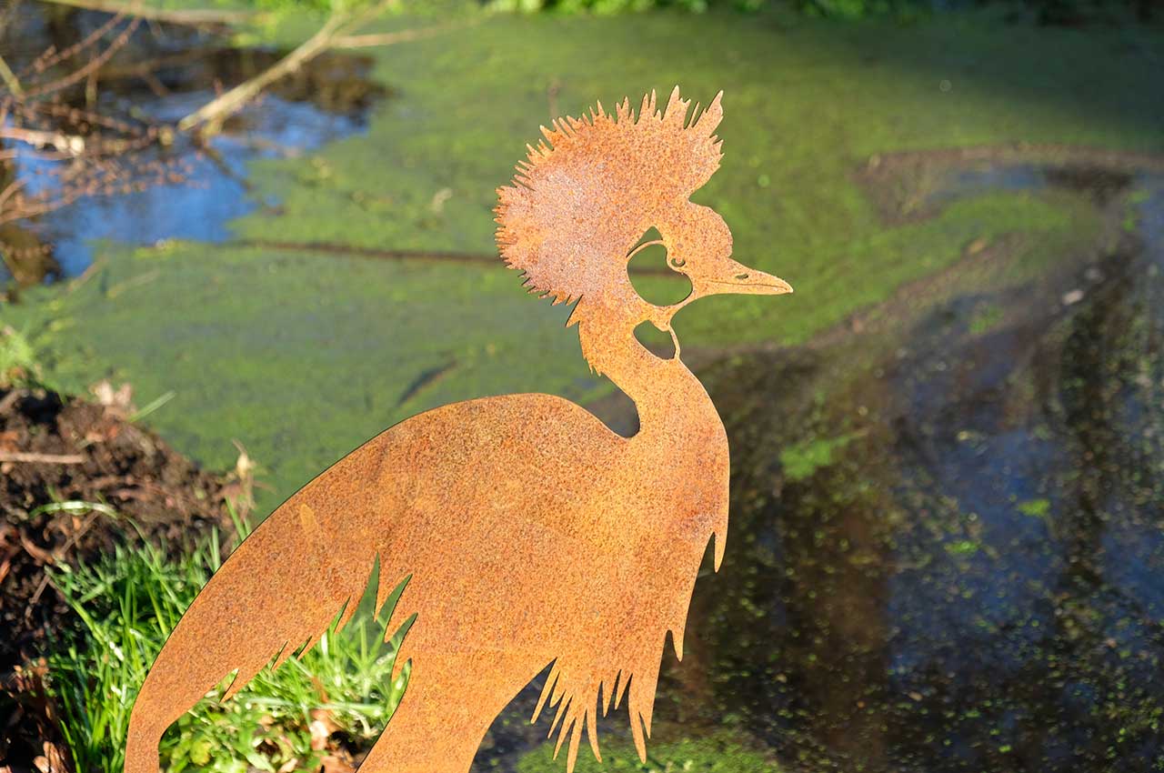 Verleihen Sie Ihrem Garten Flair: Setzen Sie den majestätischen Kronenkranich an einem auffälligen Platz in Ihrem Garten oder auf Ihrer Terrasse oder am Teich in Szene, um die bewundernden Blicke Ihrer Gäste zu genießen.