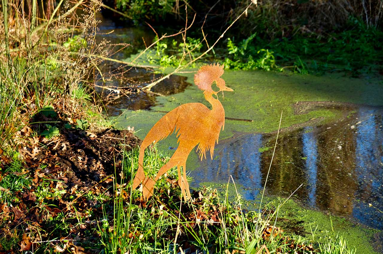 Verleihen Sie Ihrem Garten Flair: Setzen Sie den majestätischen Kronenkranich an einem auffälligen Platz in Ihrem Garten oder auf Ihrer Terrasse oder am Teich in Szene, um die bewundernden Blicke Ihrer Gäste zu genießen.