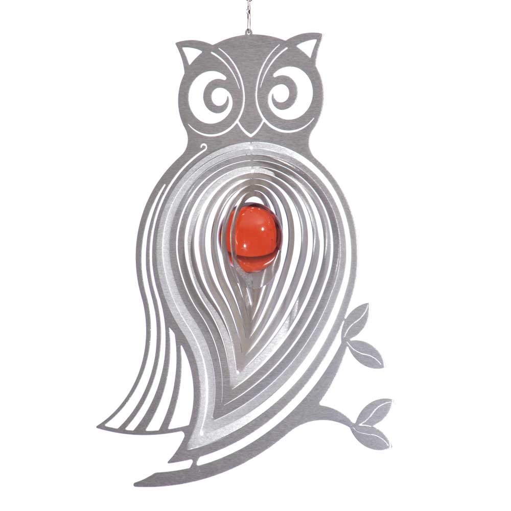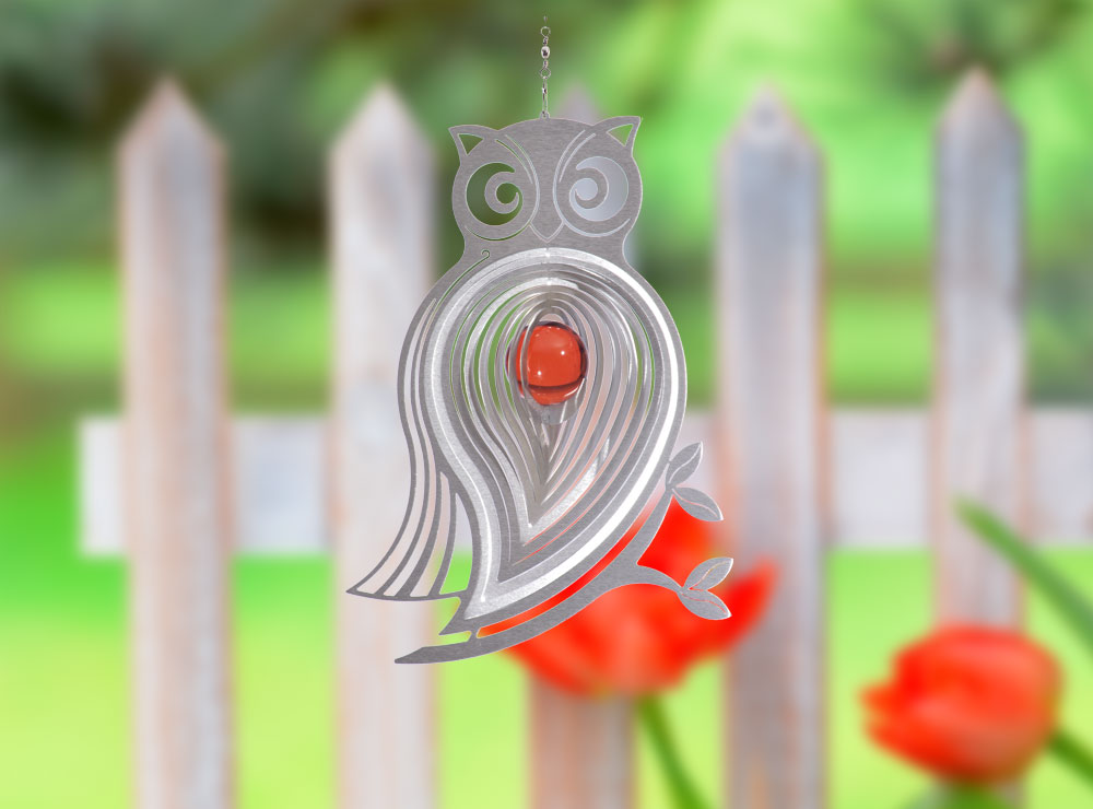 Das Edelstahl-Windspiel Eule - Athena kommt mit schillerndem Gefieder daher. Beim leisesten Luftzug dreht sich dieses naturverbundene Windspiel Eule Athena und ist ein wunderschöner Blickfang auf der Terrasse oder frei im Raum.