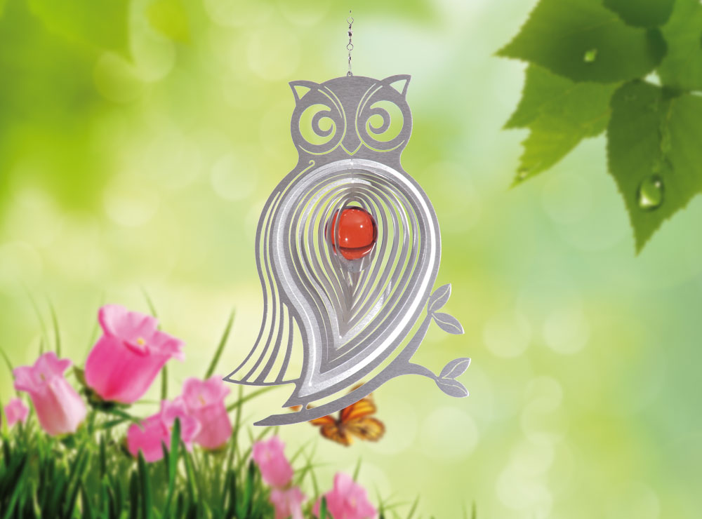 Das Edelstahl-Windspiel Eule - Athena kommt mit schillerndem Gefieder daher. Beim leisesten Luftzug dreht sich dieses naturverbundene Windspiel Eule Athena und ist ein wunderschöner Blickfang auf der Terrasse oder frei im Raum.