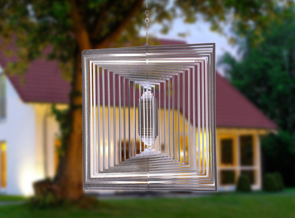 Dieses quadratische Edelstahl-Windspiel mit seiner exakten Kantenführung ist ein wunderschöner Kontrast zu weichen Konturen.